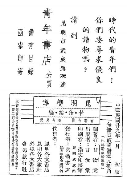分概况、到昆明的路径、名胜古迹、交通、生活、物产、官署社园、街巷、文选等9章。第9章文选、收游记6篇